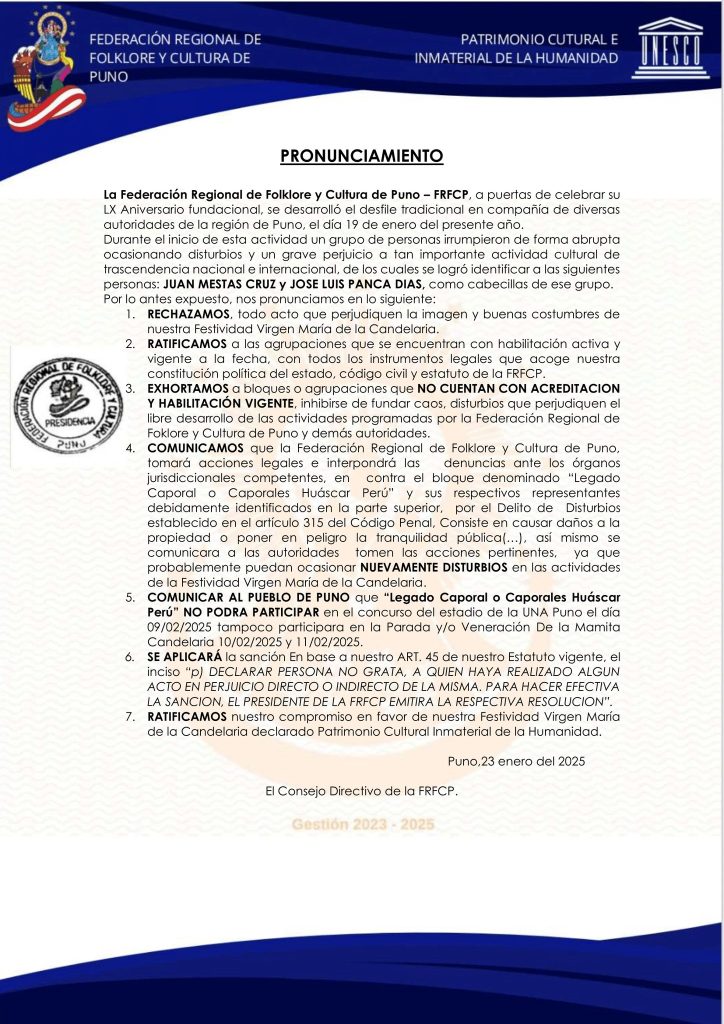 La Federación Regional de Folklore y Cultura de Puno (FRFCP) ha emitido un pronunciamiento oficial ante los disturbios ocurridos el 19 de enero de 2025 durante el desfile tradicional de su 60.º aniversario. Estos incidentes, que involucraron al grupo “Legado Caporal o Caporales Huáscar Perú”, ocasionaron daños considerables a esta emblemática festividad de la región y el país.